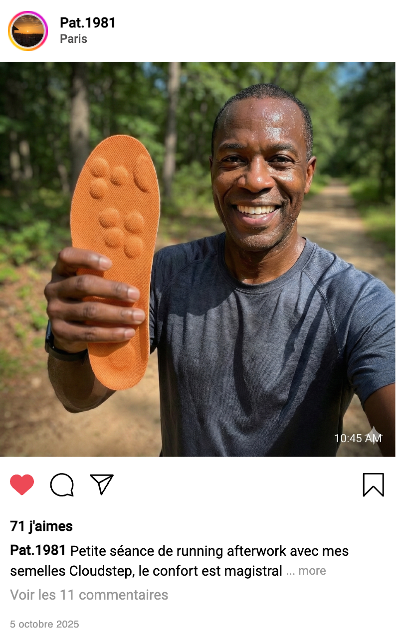 Pour un confort optimal, nous recommandons de retirer la semelle amovible d'origine de vos chaussures avant d'insérer votre paire de Cloudstep. Cela permet de conserver l'espace nécessaire pour votre pied tout en profitant d'un amorti supérieur.
